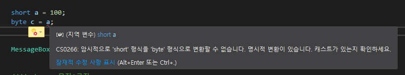 위 경우를 보면 Byte는 0~255까지 이고 short는 -32,768 ~32,767까지의 숫자를 담을 수 있다.