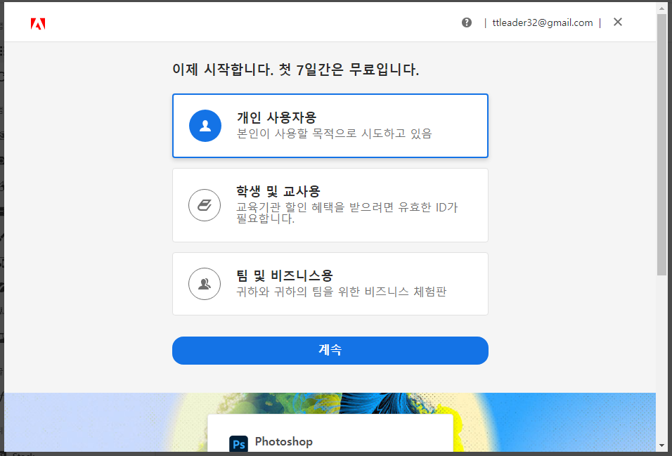 포토샵 설치파일을 바로 다운받는 방식이 아닙니다.