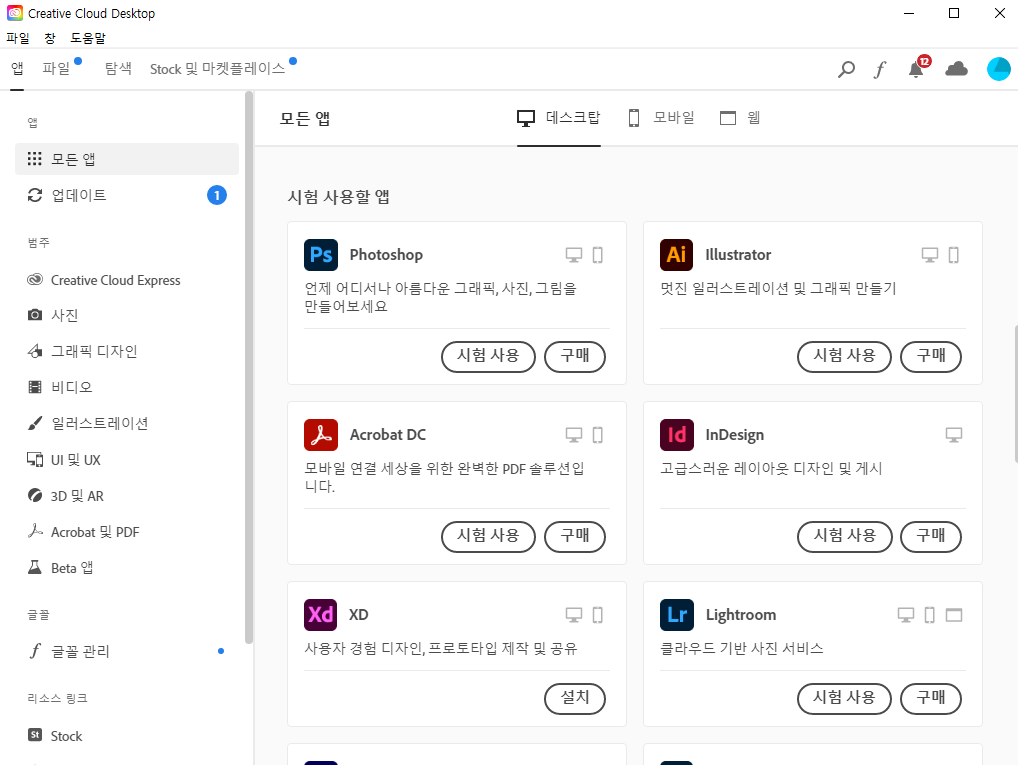 모든앱 시험사용할 앱에 Photoshop 항목이 있습니다.