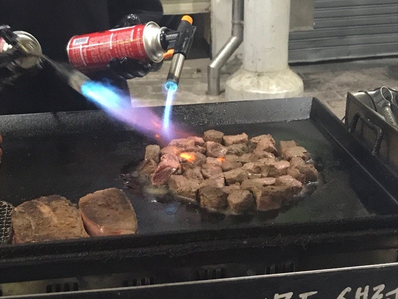 Unlike typical steaks served as a large slab, this version features bite-sized cubes of beef, often marinated and skewered. These juicy little cubes are seared to perfection using a handheld blowtorch right before your eyes, giving them a smoky, caramelized exterior while keeping the inside tender.