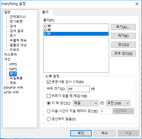 Everything 실시간 파일/폴더 검색 작은 설치파일 깔끔하고 단순한 UI 빠른 파일 색인 빠른 검색 최저 자원 사용 쉬운 파일 공유 실시간 갱신 등등... Everything 1.4.1.1000 다운로드 32비트 설치파일 64비