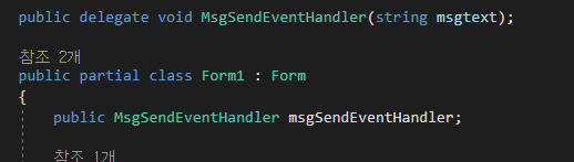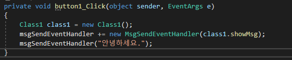 Form1에서 버튼을 클릭하면 Form1 클래스에 선언했던 Delegate( MsgSendEventHandler) 에 Class1의 showMsg함수를 연결해준다. (Delegate Chain)